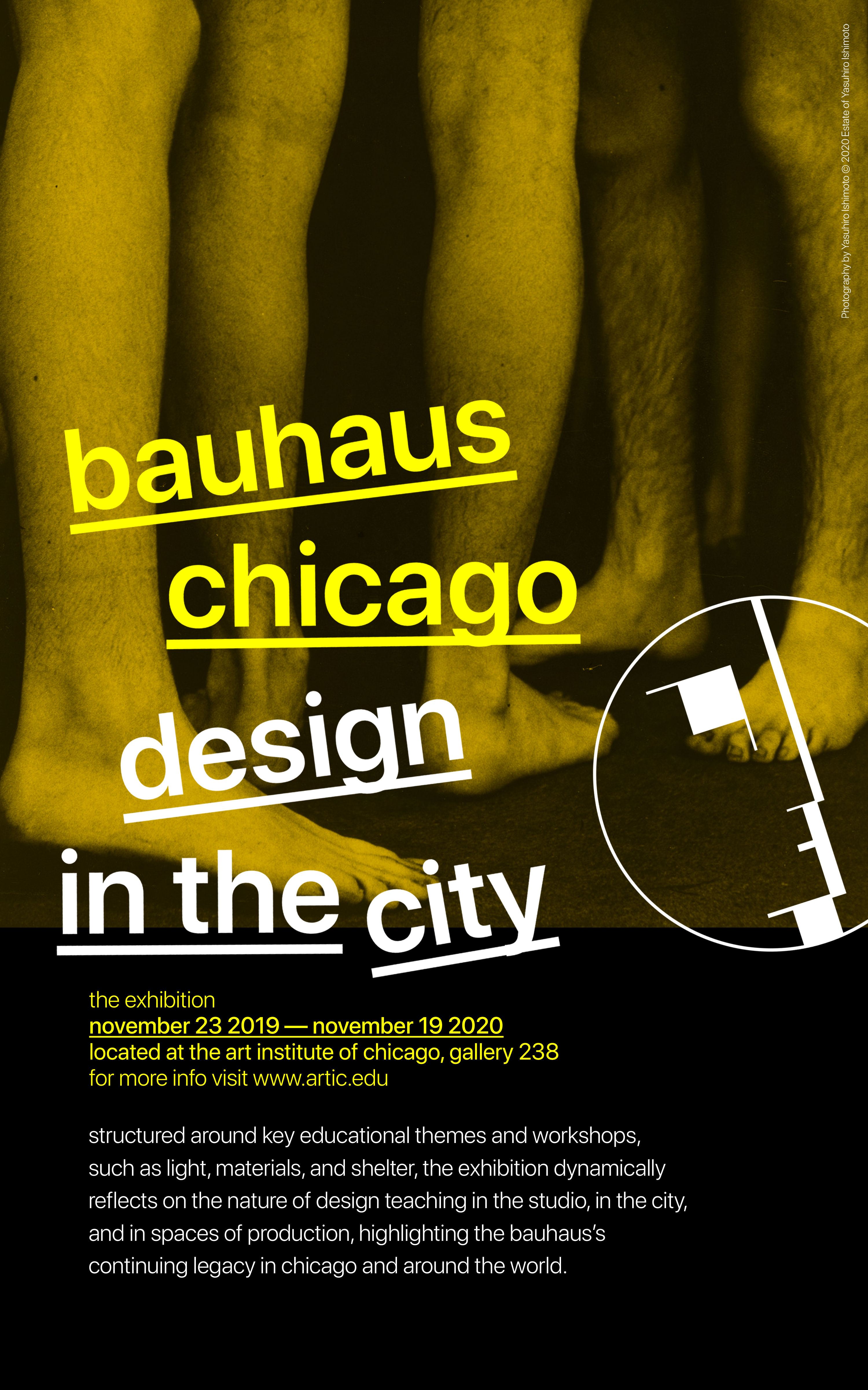 I approached this assignment as an opportunity to explore the relationship of image and text by creating a functional and informational series of three posters related to the theme of Bauhaus Chicago. One poster is used for an exhibition, one for a gallery talk, and one for a documentary film screening—all contextualized within The Art Institute’s exhibition “Bauhaus Chicago: Design in the City”.